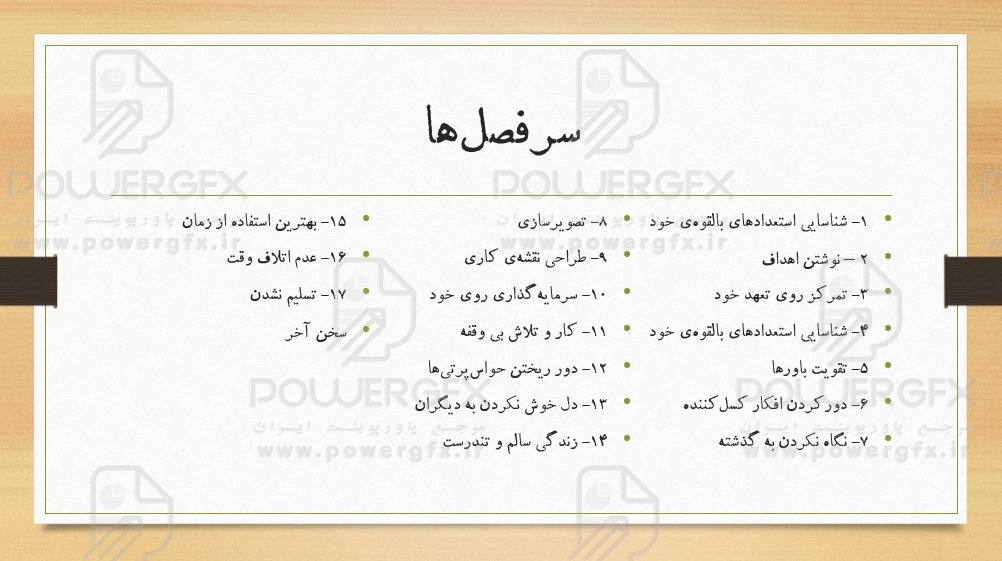 در این پاورپوینت مجموعه راهکارهایی برای کسب موفقیت در زندگی روزمره و شغل ارائه می‌شود. این راهکارها در 17 محور عبارتند از: شناسایی استعدادهای بالقوه‌ی خود، نوشتن اهداف، تمرکز روی تعهد خود، شناسایی استعدادهای بالقوه‌ی خود، تقویت باورها، دورکردن افکار کسل‌‌کننده، نگاه نکردن به گذشته، تصویرسازی، طراحی نقشه‌ی کاری، سرمایه‌گذاری روی خود، کار و تلاش بی وقفه، دور ریختن حواس‌پرتی‌ها، دل خوش نکردن به دیگران، زندگی سالم و تندرست، بهترین استفاده از زمان، عدم اتلاف وقت، تسلیم نشدن