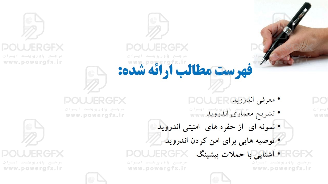 تصاویر پاورپوینت فقط در سایت به صورت نمونه و واتر مارک شده توسط لوگوی سایت هستند! خود پاورپوینت فاقد لوگوی سایت بوده و قابل ویرایش است.