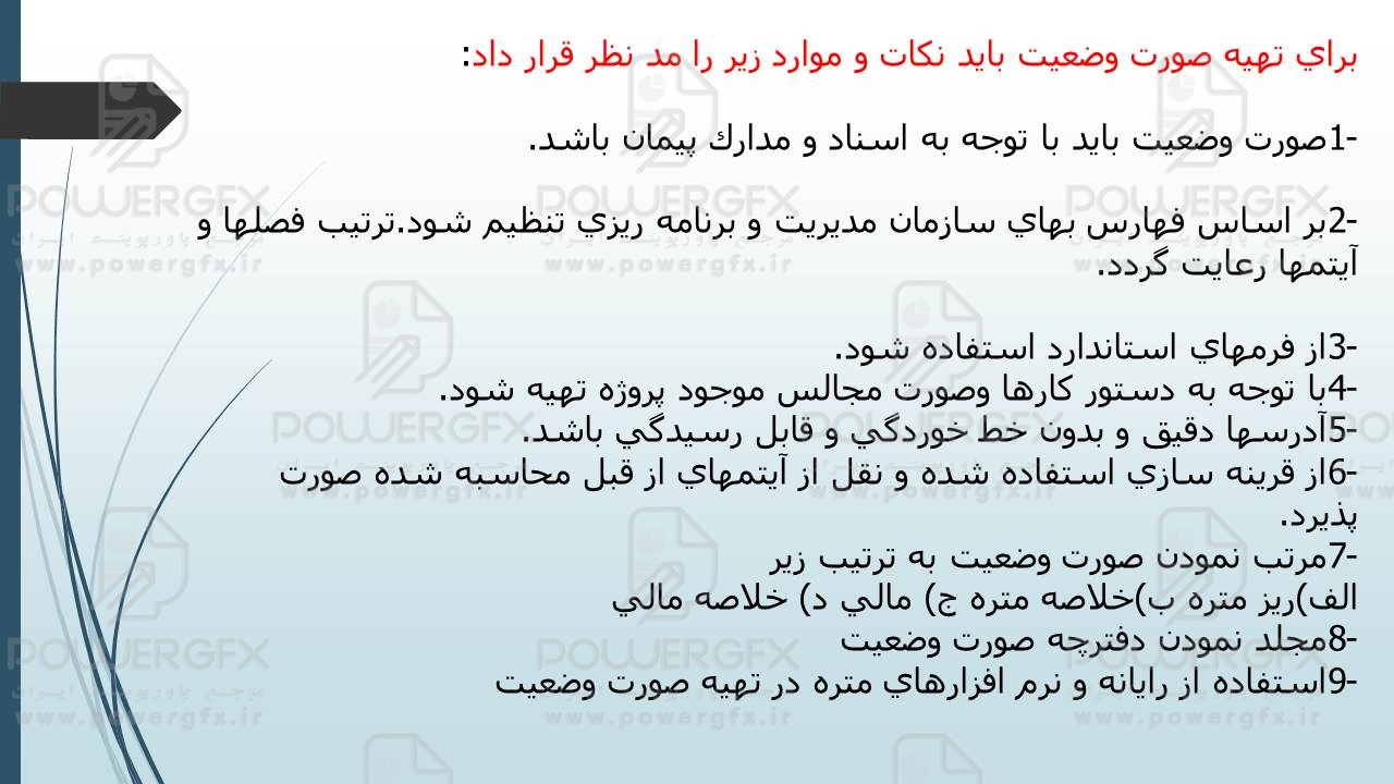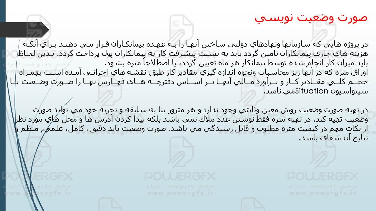 صورت وضعیت:صورت وضعیت یعنی گزارش ریز مقادیر انجام عملیات و مالی کردن آن به طور کامل به نام درخواست مالی دریافت وجه در قالب موضوع پیمان از بابت عملیات انجام شده و قیمتهای توافق شده.