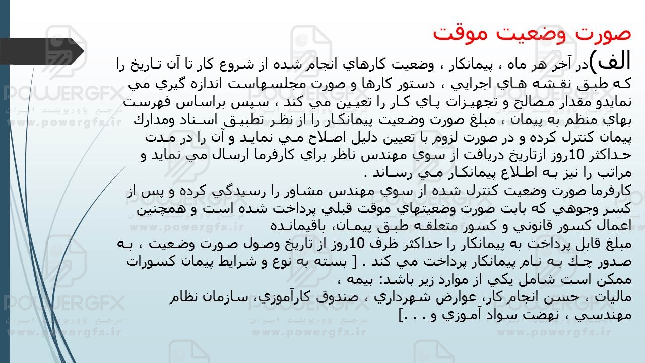 صورت وضعیت می تواند موقت و می تواند قطعی باشد. پیمانکار معمولا در انتهای هر ماه مقادیر کارکرد عملیاتش در آن ماه را در قیمتهای توافق شده ضرب کند و با ضرائب توافق شده درخواست مالی خود را ارائه کند.مهلت پرداخت صورت وضعیتهای موقت ۱۰ روز رسیدگی در مشاور و ۱۰ روز رسیدگی و پرداخت در کارفرما می باشد.